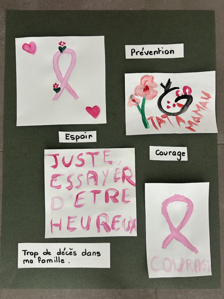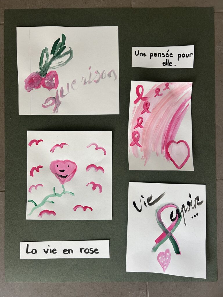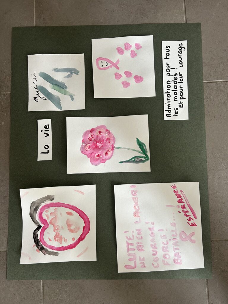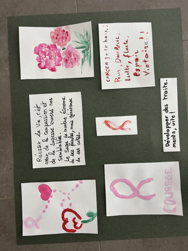 Sur la belle idée de Danièle, les marcheurs ont pu avec les atelier du grillon exprimer ce que leur évoquait le cancer : un mot, un dessin.