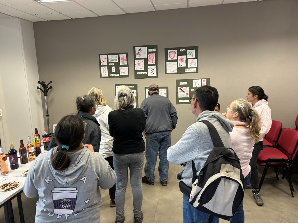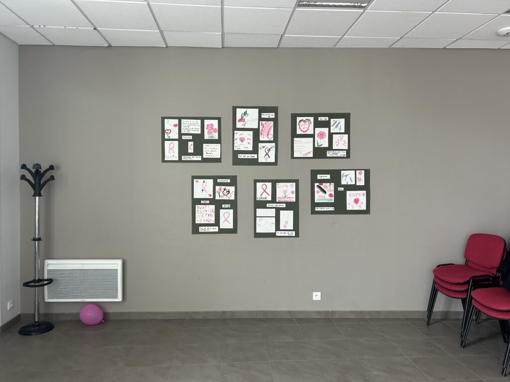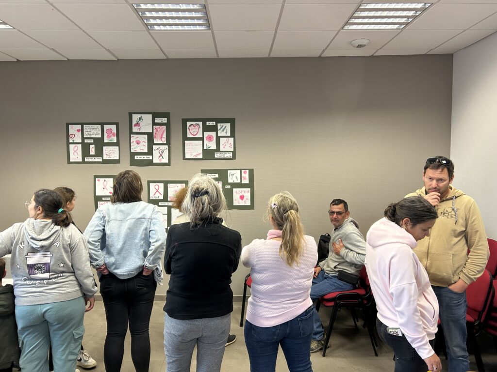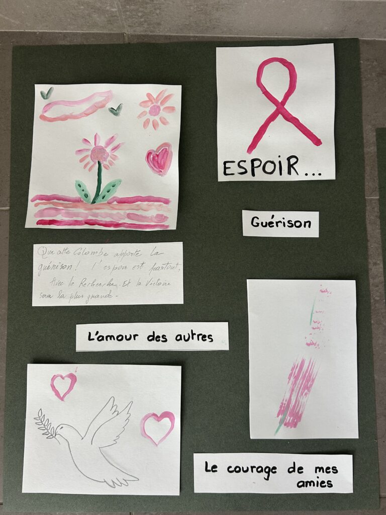 Sur la belle idée de Danièle, les marcheurs ont pu avec les atelier du grillon exprimer ce que leur évoquait le cancer : un mot, un dessin.